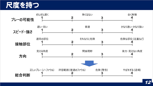 - テーマである「警告・退場」を見極めるためにどのようなことを考慮すべきか検討しました。はじめに皆で映像を見て、どのような事象だったか意見を出し合いました。その後、警告・退場を判断するために「尺度」を持ちましょうというお話があり、関連しそうなコンシダレーションポイントを「尺度」としてスコア付けすることで、事象を分析しました。また、今回のポイントとして、答えを求めるのではなく、自分の考えをしっかりと持ち、他の参加者の考えも聞くことで判定をするまでの過程を大切にしてほしいことをお話ししていただきました。