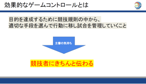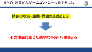 - まだ担当した中で荒れた試合というのはなかったが、これから必ず出てくるので、今回学んだ効果的なゲームコントロールを意識していきたいと思います。