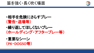 - 笛の強弱、長短、使う所の大切がわかった。また、注意をするなら、早く端的にわかりやすく伝える。クイックですぐに再開させたいと選手が思っている場合は、プレーが落ち着いた所、アウトオブプレーになった所でプレーを止め、「さっきの〇〇らへんでやったことだけど〇〇だからダメだよ」などの端的にわかりやすく伝えれば良いとわかった。