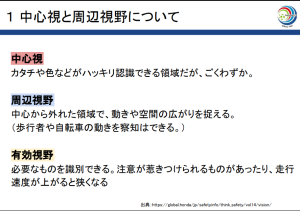 ・受講生の皆さんで画像を使いながら中心視と周辺視野について学びました。色や形がハッキリと見える範囲には限界があり、どこにフォーカスをするかが重要になります。