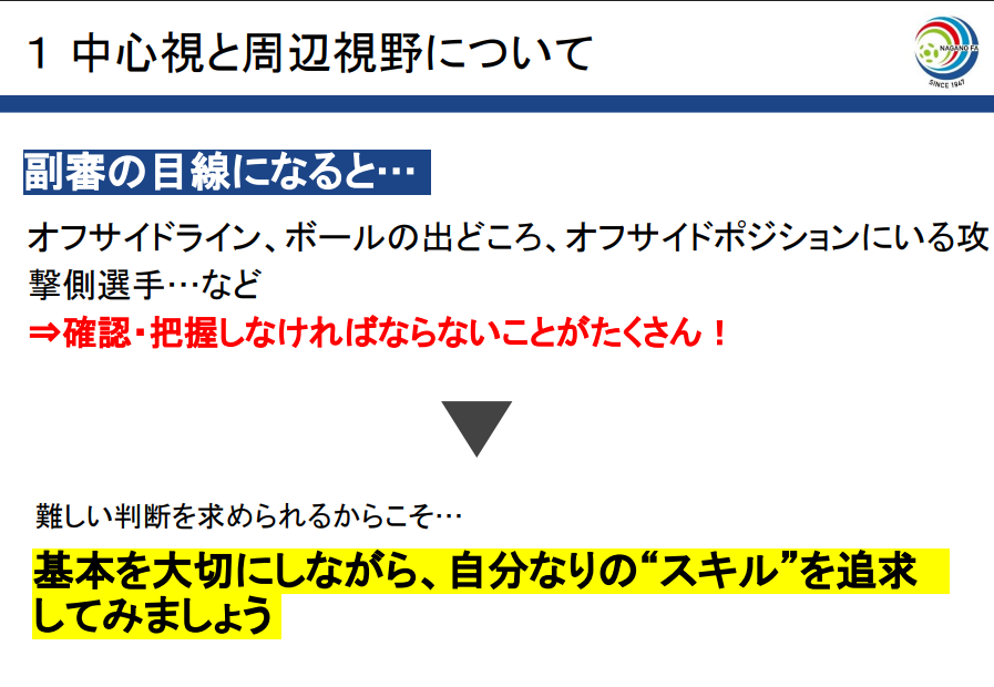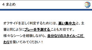 - 副審として視野の考え方を用いて見るべきものを把握できるようにするとともに、集中力を継続させる、自分の頭の中を整理するため状況を声に出したりする工夫を取り入れていきたい。
