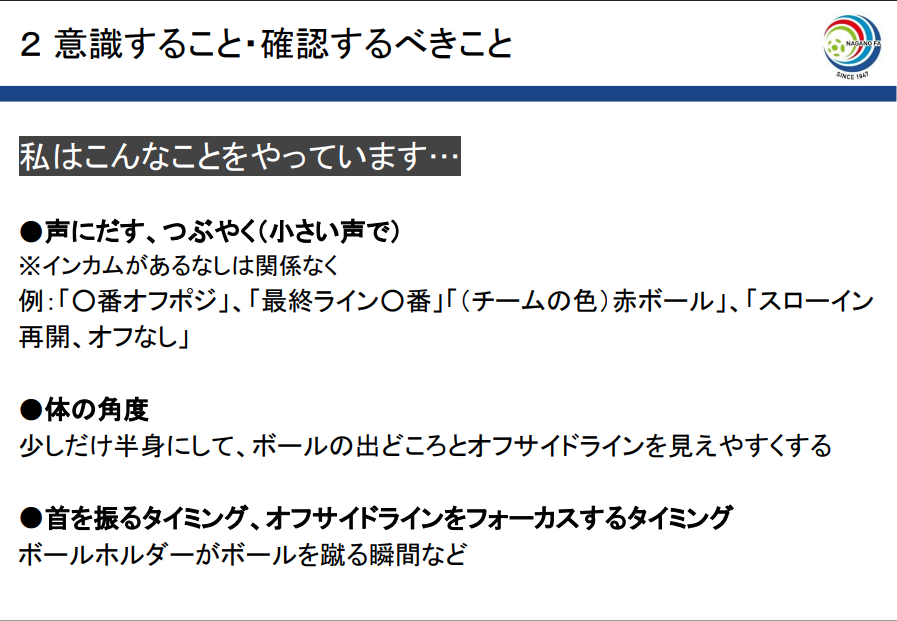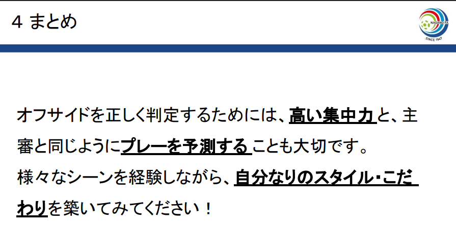 - フォーカスに関してもとても勉強になりました。 早く首を振り、全体を捉えられるように余裕を持って行動したいです。 オフサイドの判定は本当に奥が深いと思います。 ボールを蹴る瞬間、視覚と音でオフサイドラインを的確に判断できるようにシーズンに向けていきたいです。