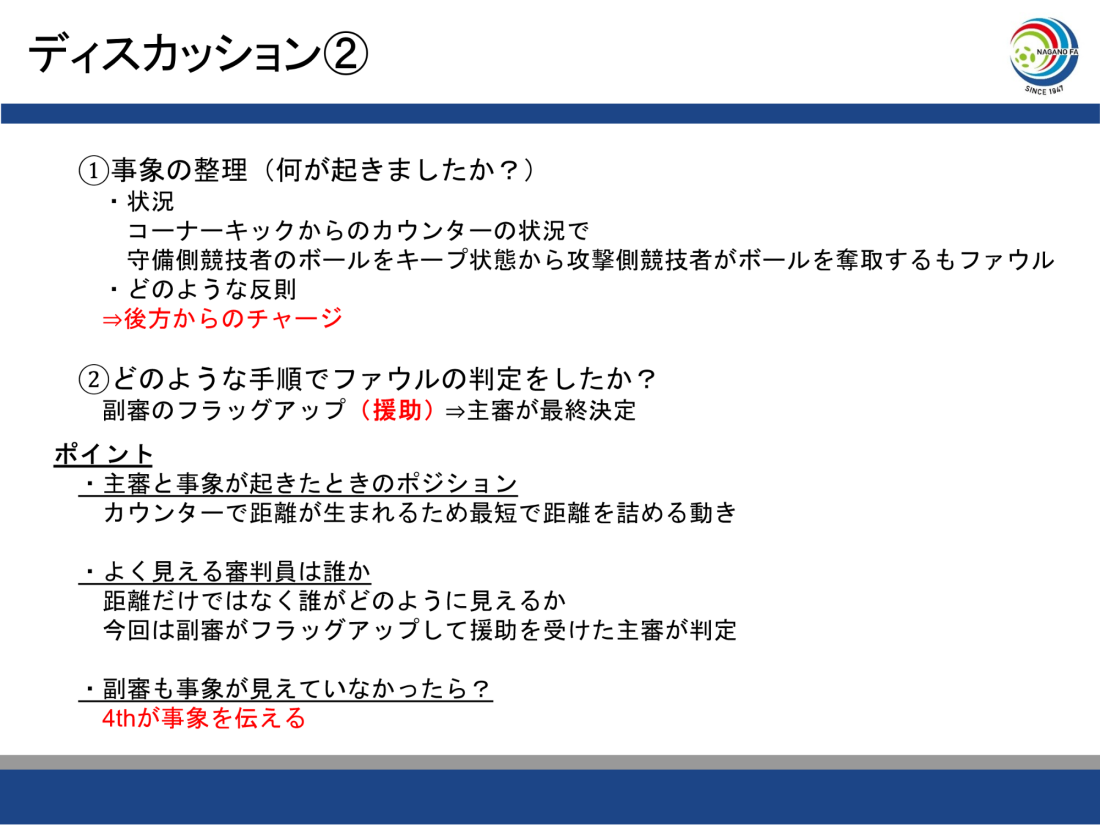 ・改めて、試合前の審判ミーティングの重要性を感じました。副審・4thのファウルサポートの方法について、事前に主審と相談して決めておくことを心掛けて参ります。
