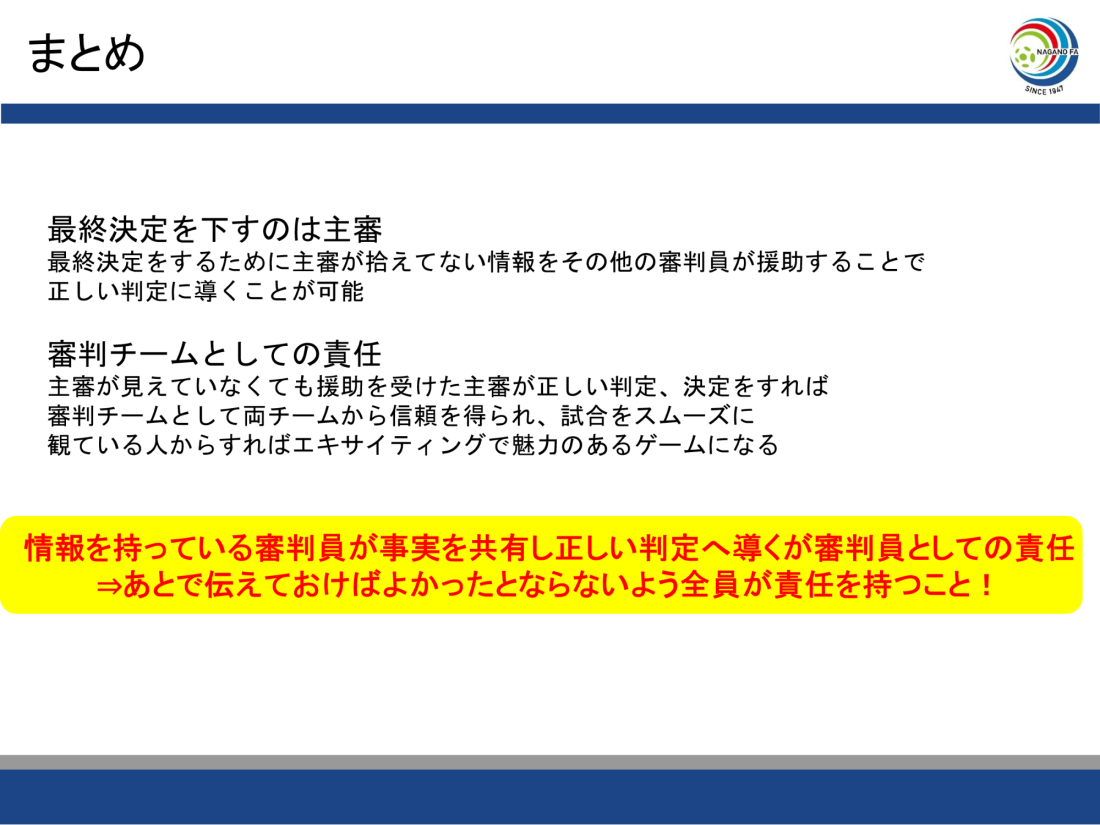 最終決定は主審だが、勇気を持って伝えることの重要性を受講者で再確認しました。
