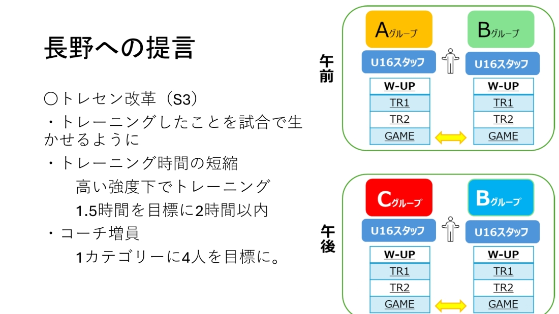 → 通訳を介して、ポルトガル語を訳してもらいました。日本の選手たちへとなると英語を交えながらだったり、通訳を介してとなったりするだろうと思います。今回の通訳の方はサッカーを良く知っている方で、大変スムースでした。 - 資料で提示できるものがあればお願いしたい。